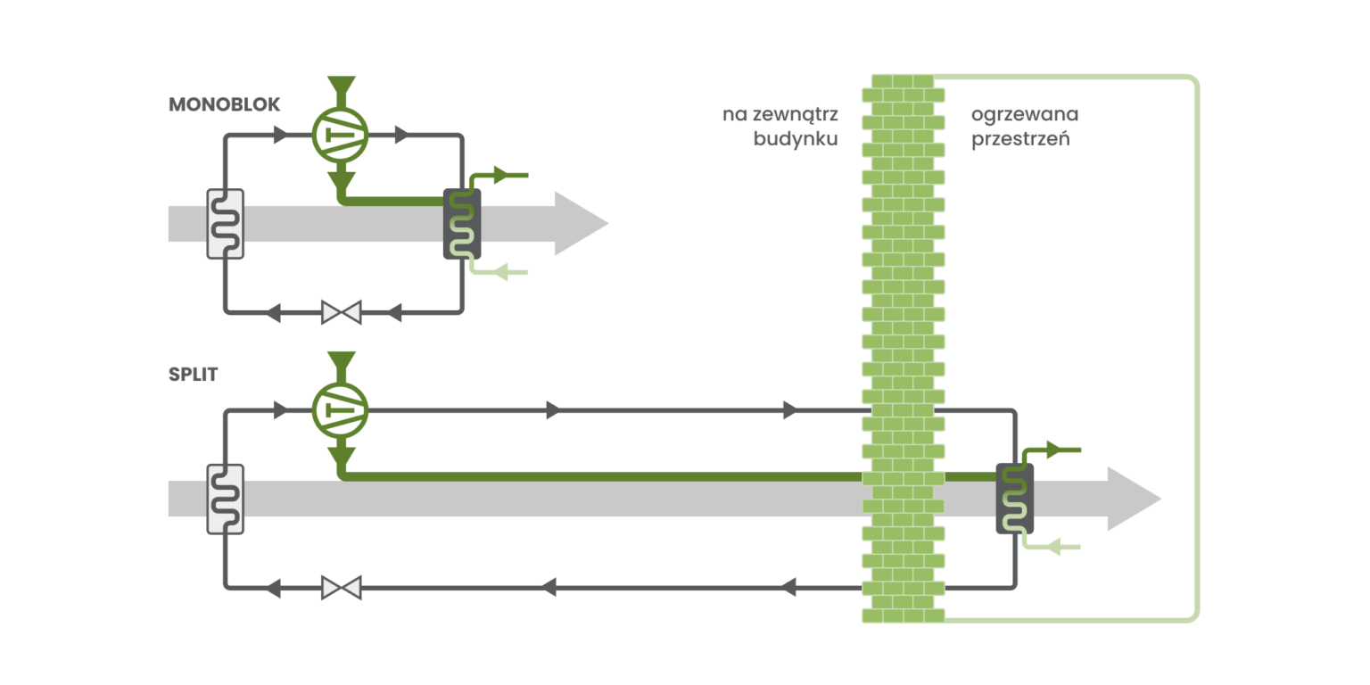 - w konstrukcji monoblok elementy składowe są połączone w całość. Wszystkie ważne elementy znajdują się w jednym urządzeniu (jednostce zewnętrznej). To upraszcza jej instalację
